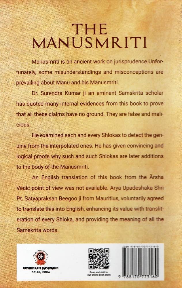 The Manusmriti – English Translation Hardcover – 1 January 2022 by Manu (Author) (Author), Dr Surendra Kumar (Narrator & Translator) (Author), Satya Prakash Beegoo (English Translator) (Author)
